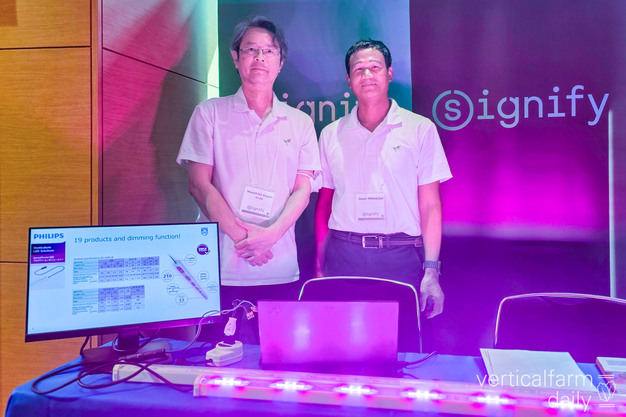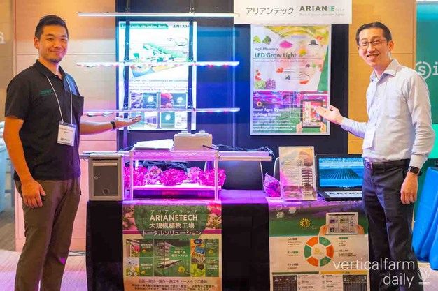 Dice K. Isayama y Edwin Ong, de Arianetech Co., muestran sus soluciones de iluminación.