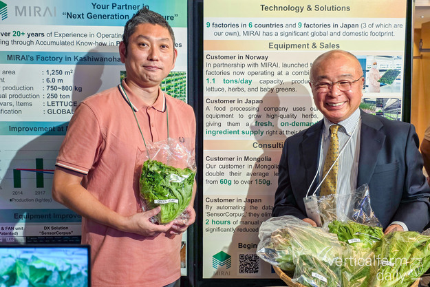 Nagateru Ozawa y Yoshio Shiina, de MIRAI, presentan sus vegetales de hoja.
