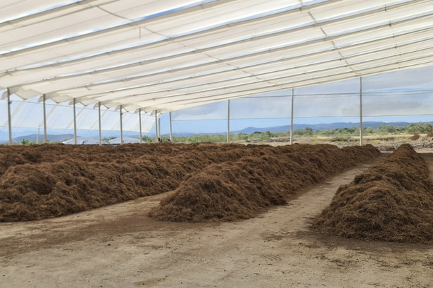 © Aldea VerdePilas de volteo dinámico de una planta de compostaje de bagazo de agave mezcalero y vinazas, bajo techado y con suelo estabilizado.