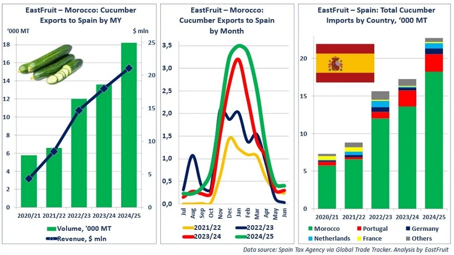 © EastFruitLos pepinos marroquíes se suministran durante todo el año, con volúmenes máximos entre diciembre y febrero. Solo en enero de 2025, Marruecos exportó a España la cifra récord de 3.500 toneladas. Durante diciembre y enero, los pepinos marroquíes representaron más del 90% de las importaciones totales de pepino de España.