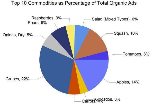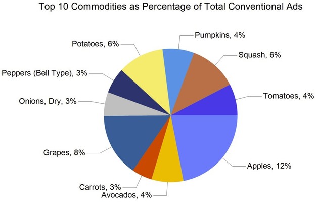 Las variaciones de precios de los principales artículos anunciados (3.000 o más anuncios) en comparación con la misma semana del año anterior incluyen un aumento del 12% para las manzanas Honeycrisp (por libra) y del 10% para las manzanas Gala (bolsa de 3 libras). Las peras Bartlett (por libra) han bajado un 18% y los aguacates (cada uno) un 13%. Las patatas y las cebollas no han registrado cambios significativos de precio en la semana 39. En el caso de las hortalizas, no ha habido aumentos notables, pero las calabazas han bajado un 11%.