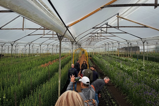 Una de las paradas destacadas fue en La Plazoletta, una finca que este año celebra nada menos que cuatro décadas de trayectoria en el sector floral. De la mano de Christian, los asistentes recorrieron sus 40 hectáreas de cultivo, donde se producen variedades como alstroemeria, solidago, boca de dragón y statice. Con un equipo humano de 700 personas —el 80% mujeres—, la finca genera semanalmente alrededor de 80.000 tallos de alstroemeria, con una oferta de 40 variedades distintas.