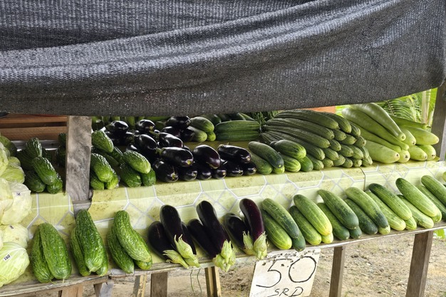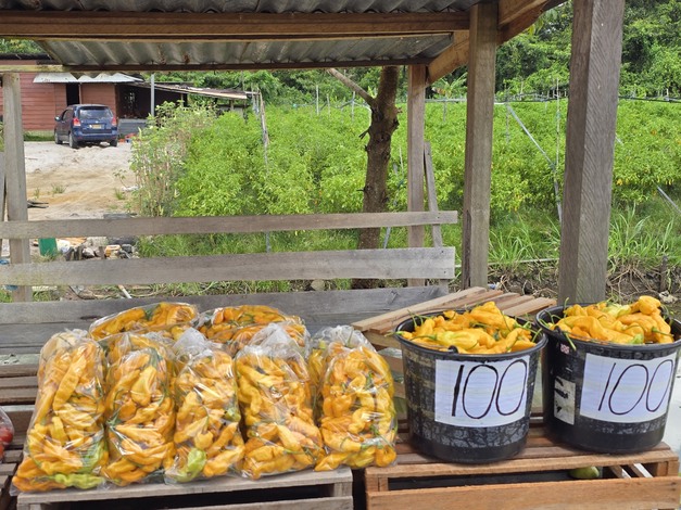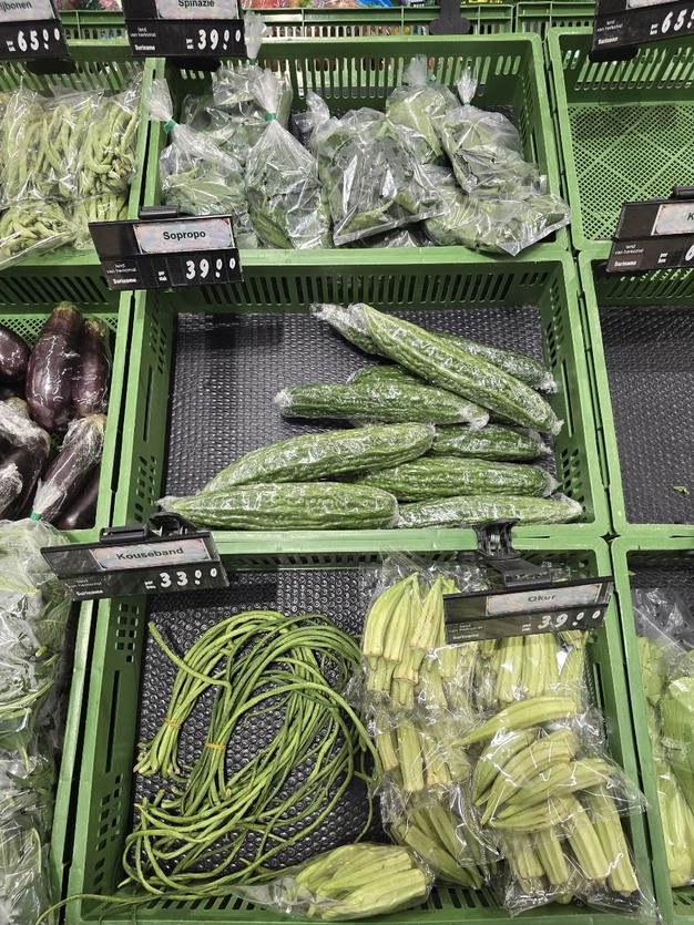 En cuanto a las cucurbitáceas, no solo el pepino y el pepinillo tienen presencia en Surinam. También destaca la sopropo o melón amargo, una fruta de piel rugosa originaria de Asia y África que se consume cocida, tras recolectarse aún verde. Otra verdura que forma parte de esta escena es la okra, de herencia africana, que por su aspecto puede recordar a un ají verde, aunque pertenece a una familia botánica completamente distinta.