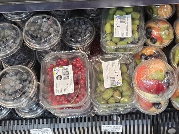 En la sección de frutas, no podemos dejar de mencionar el bacove (banano), lemmetje (lima), manja (mango), markoesa (nombre derivado del maracuyá), acerola —conocidas localmente como cereza—, papaya y guayaba. Todas estas frutas, con su explosión de colores y sabores, son propias del clima tropical y forman parte integral del paisaje agrícola y culinario surinamés.
