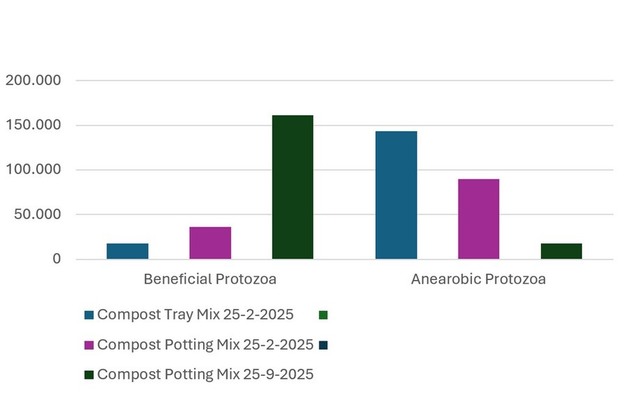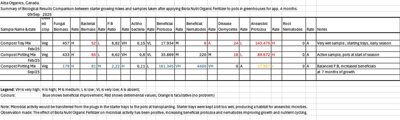 Para garantizar el mejor soporte técnico, Biota encargó al especialista en suelos Robby Grass ayudar a Shawn, trabajando en estrecha colaboración con el equipo técnico de Biota en Países Bajos. Robby llevó a cabo análisis de la vida del suelo de Northstar Organics. La primera medición tuvo lugar en febrero de 2025 y la segunda en septiembre de 2025.