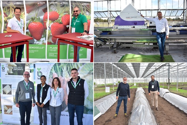Del lunes 7 al viernes 10, 480 visitantes tuvieron la oportunidad de descubrir 7 explotaciones de espárragos, fresas, arándanos y otros frutos rojos situadas en las regiones de Gironda, Dordoña y Lot y Garona, así como los dos centros de investigación: CTIFL e Invenio. Al mismo tiempo, los diseñadores de la maquinaria y los equipos utilizados para estos cultivos presentaron sus equipos en condiciones reales. La feria, que se celebró el miércoles 8 y el jueves 9 de octubre en el interior de un invernadero fotovoltaico de la empresa Planasa, reunió a 104 expositores de toda Europa. En total, casi un millar de visitantes de 29 nacionalidades diferentes participaron en estos encuentros profesionales. Un formato original, que se aleja de lo establecido en las ferias tradicionales en las que reina la luz artificial. Aquí, los rayos del sol atravesaron las paredes acristaladas del invernadero para iluminar los tabiques blancos que separaban los stands, creando un contraste sencillo pero elegante con la arena negra sobre la que se exponían los equipos. Una puesta en escena sobria y natural, centrada en lo esencial: la luz, la tierra y quienes le dan vida.