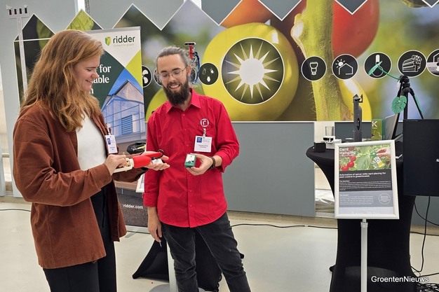 RoboHouse mostró una aplicación robótica para colocar bolsas biológicas en el cultivo. La aplicación, desarrollada en colaboración con Koppert, Octiva y TU Delft, aún no se ha probado en el invernadero de Tomatoworld.