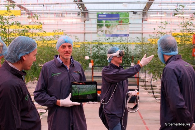 Esta peculiar escena en el invernadero de Honselersdijk ha sido parte de una demostración de las posibilidades de la tecnología inmersiva en horticultura. La demostración ha tenido lugar en el marco de la Jornada de Demostración NXTGEN Hightech - Datos e infraestructura en la horticultura de invernadero.