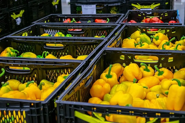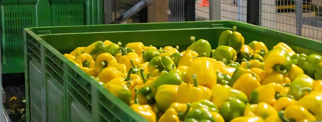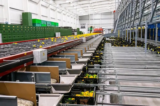 A continuación, las cajas de gran volumen se transportan a una ubicación central en la que tiene lugar el proceso de clasificación. Sistemas totalmente automáticos clasifican los pimientos en función de su tamaño y calidad, tras lo cual se envasan en cajas plegables de plástico para su posterior distribución.