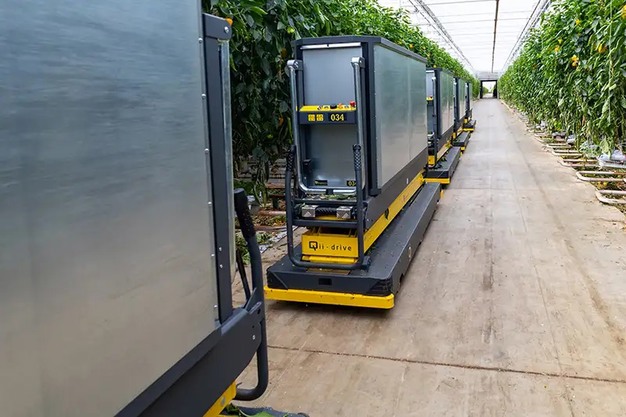 Los carros automatizados llevan los pimientos recolectados al muelle de carga