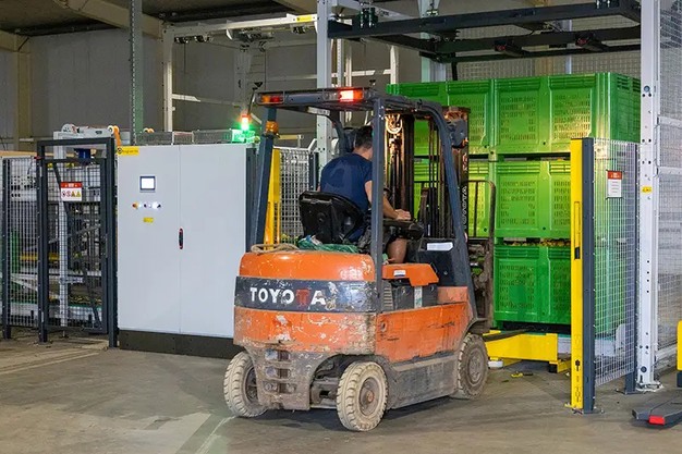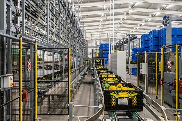 En la práctica, el proceso es el siguiente: desde los invernaderos salen carros automatizados llenos de pimientos que los llevan a la zona de carga. Allí, las cajas se vacían en una cinta transportadora, tras lo cual los pimientos se transfieren cuidadosamente a cajas paletizadas extra anchas de gran volumen. Estas cajas se llevan luego directamente a la sala de refrigeración para mantener la frescura del producto.