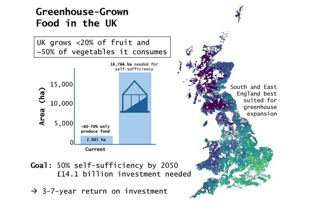 Para alcanzar el 50% de autosuficiencia en frutas y hortalizas cultivadas en invernaderos en 2050, el Reino Unido tendría que cuadruplicar su capacidad, lo que requeriría una inversión de unos 14.100 millones de libras. Sin embargo, los beneficios son prometedores: un periodo de amortización de entre 3 y 7 años, impulsado por la reducción de las importaciones y la demanda del mercado nacional.