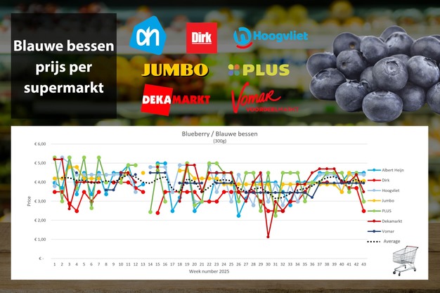 © Supermarktscanner.nlHa habido muchas promociones con los arándanos. En la semana 43, PLUS es la que más ha bajado el precio (1,50 euros), pero Dirk tiene el precio más bajo (2,49 euros). DekaMarkt también ha rebajado el precio en 90 céntimos. Por tanto, el precio medio del arándano se ha reducido significativamente, en 51 céntimos.