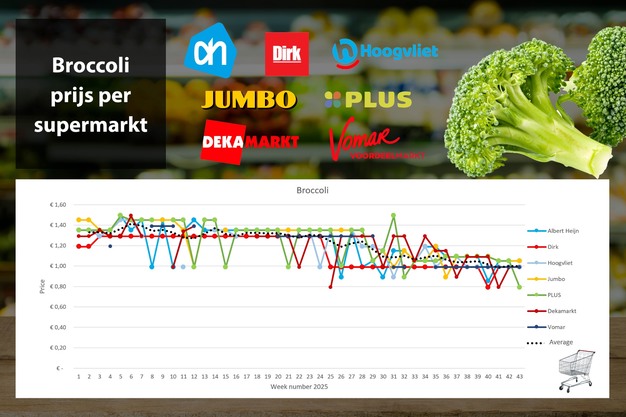 © Supermarktscanner.nlEn la semana 43, PLUS ha estado ofreciendo el brócoli con 26 céntimos de descuento, a un precio de 0,79 euros (antes, 1,05 euros). Esto ha hecho que el precio medio baje 4 céntimos, hasta situarse por debajo del euro (0,98 céntimos).