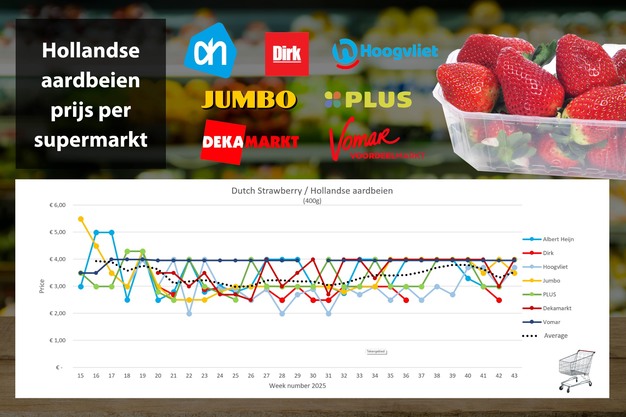 © Supermarktscanner.nlLa temporada de otoño parece haber terminado ya. Solo Jumbo tiene el producto en oferta, con un precio rebajado de 3,99 euros a 3,49 euros. En otras cadenas de retail, los precios han vuelto al nivel de la semana anterior. Dirk no tiene fresas disponibles online. El precio medio semanal es de 3,85 euros, 65 céntimos más que en la semana 42.