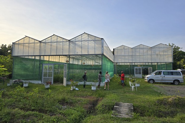 Al principio, Nesta trabajaba con cultivos al aire libre. "Pero en un invernadero puedes protegerlos de la lluvia y los insectos y darles sombra", señala. Así que construyó un invernadero de madera, pero la cubierta plana no fue rival para las lluvias tropicales. "Acabaron por derrumbarlo. Entonces hice el tejado en forma de V para que drenara mejor".