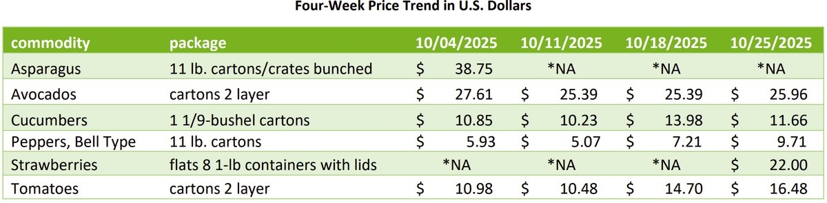 Las importaciones de Perú a través del sur de California están disminuyendo, con un comercio moderado y precios más bajos. Las cajas de espárragos verdes de 11 libras cuestan en su mayoría US$40.75-42.75 para los jumbo y extra grandes, US$34.00-36.75 para los grandes, US$30.00-32.00 para los estándar, y US$28.00-30.00 para los pequeños; los blancos grandes cuestan US$42.00-44.00. Los envíos desde México a través de Arizona, California y Texas también están disminuyendo ligeramente, y la mayoría ya están reservados.