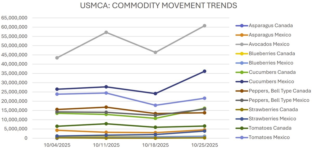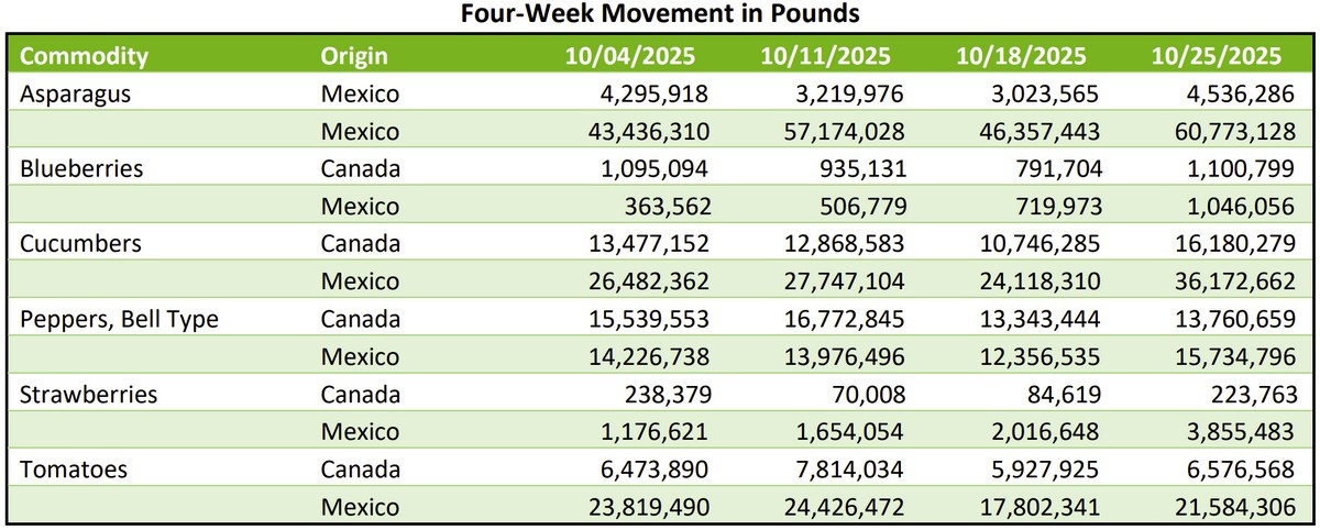 Las importaciones de Perú vía Miami, Filadelfia y Nueva York están aumentando a medida que avanza la temporada, con un comercio activo y buena calidad. Los envíos mexicanos y chilenos también están aumentando, aunque los volúmenes actuales son limitados y los mercados aún no están establecidos. Los primeros informes F.O.B. de Chile se esperan para finales de octubre.
