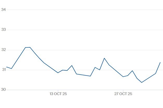 El precio del gas TTF para el contrato Cal 2026 hasta el 4 de noviembre. Pulse aquí para consultar los precios actuales de los contratos de gas.