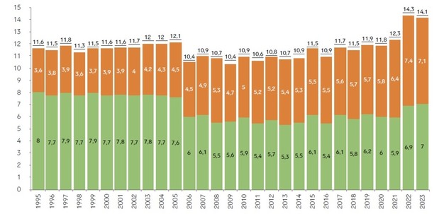 En este contexto, era inevitable que el gasto de inversión en la agricultura griega también se viera afectado. Tras el máximo histórico de 2008, las inversiones cayeron bruscamente, alcanzando incluso niveles de formación negativos en 2011-2012 y 2014-2015. Desde entonces, se ha observado una lenta recuperación hacia los niveles de 2008, que casi se alcanzaron en 2022.