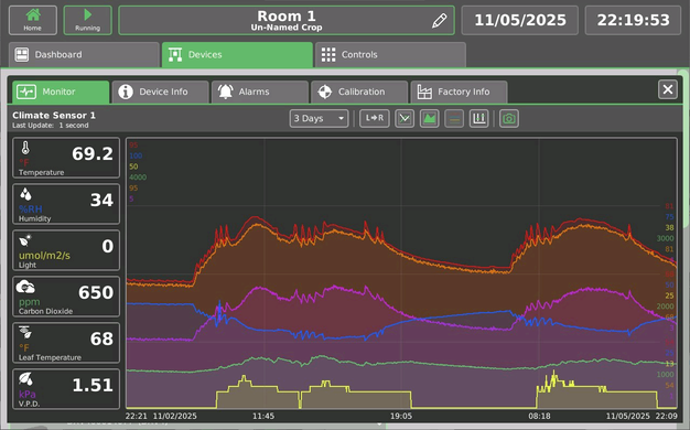 Desde el mismo controlador, los productores pueden gestionar el clima, la fertirrigación, la iluminación, la programación del riego, la mezcla de nutrientes, la gestión del dióxido de carbono, las salas de secado y mucho más. Todos los sensores y funciones se conectan al mismo sistema. "Si el controlador puede programar la alimentación, el riego y la mezcla de nutrientes, la persona queda libre para hacer lo que debe hacer", dice Mike. "Inspeccionar las plantas. Recorrer las habitaciones. Controlar las plagas. No tendrá que estar cuidando temporizadores".