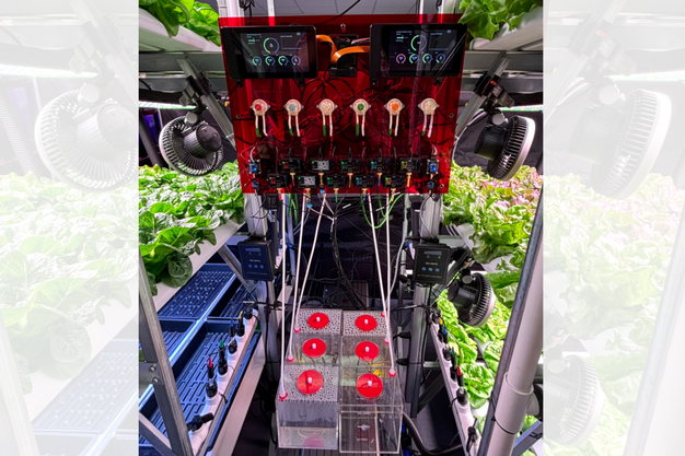 El laboratorio utiliza fórmulas nutritivas de dos partes complementadas con CalMag, mezcladas en soluciones madre in situ. "Dadas las reducidas necesidades de nutrientes de las lechugas y las hierbas aromáticas, creemos que es suficiente", afirma Regini. "Otros parámetros químicos del agua, como el pH y el ORP, se automatizan mediante nuestras líneas de fertirrigación personalizadas. Las sondas de Atlas Scientific leen los valores objetivo y las bombas peristálticas restablecen los valores de consigna".