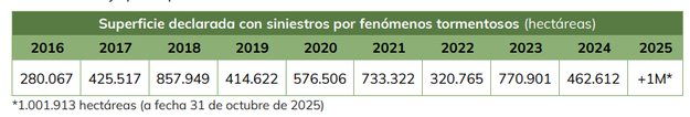 siniestro en 2025 a causa de las tormentas de pedrisco, lluvia torrencial o persistente y viento,