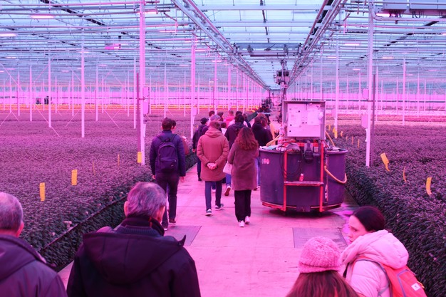 El grupo quería saber especialmente cómo funciona el cultivo de crisantemos en cuanto a sostenibilidad, cuáles son los mayores retos del productor y cuál es la diferencia entre el cultivo bajo LED en comparación con Son-T. También se habló de la estrategia de ventas y de qué características hacen que una flor sea indispensable para la venta.