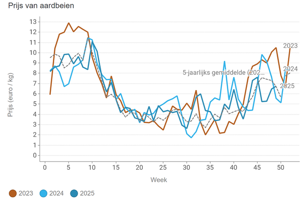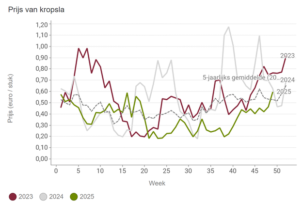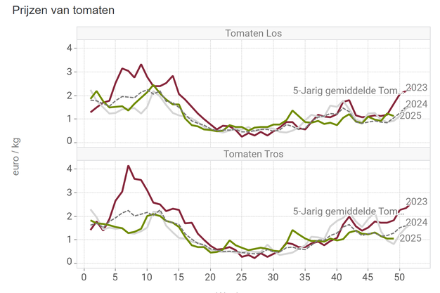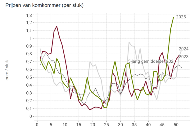 El pepino Frances , de forma alargada, alcanzó su precio máximo el 6 de diciembre (1,59 euros por kilo), tras lo cual bajó. El precio del pepino Almería, también alargado, también subió con fuerza recientemente, hasta los 2,41 euros por kilo. En este caso, el precio empezó a bajar después del 5 de diciembre. Los precios recientes también han sido excepcionalmente altos para los estándares españoles.