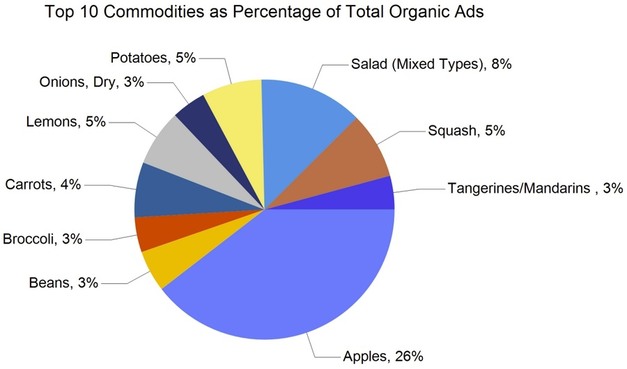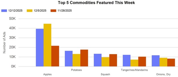 Remolachas, puerros, castañas, granadas, arándanos, nueces, berza, calabazas y uvas aparecen con frecuencia en los anuncios semanales. Los cítricos también siguieron siendo visibles como parte de los surtidos de temporada.