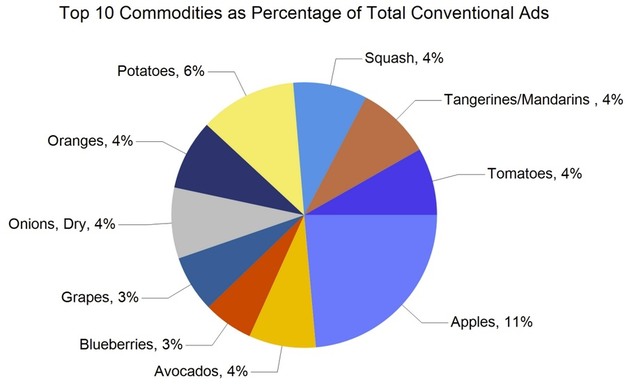 Por grupos de productos, las frutas recibieron 160.557 anuncios, lo que representa el 54% del total. Las hortalizas sumaron 96.156 anuncios, es decir, el 33%. Las cebollas y las patatas juntas representaron 28.129 anuncios, es decir, el 10%. El resto se repartió entre hierbas aromáticas (495), plantas ornamentales (5.653), cáñamo (2.149) y miel (1.733). Los productos ecológicos representaron 41.863 anuncios, equivalentes al 14% del total de artículos anunciados.