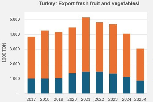 Desde abril de 2024, las exportaciones turcas de frutas y hortalizas frescas han caído con fuerza y esta tendencia a la baja se ha mantenido en 2025.