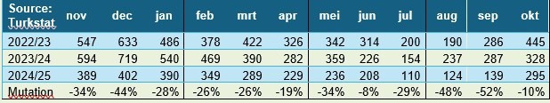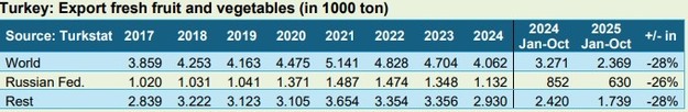 Las exportaciones turcas de productos hortofrutícolas frescos han caído (de manera sustancial) en casi todos los mercados de venta. Rusia sigue siendo, con diferencia, el principal comprador, con una cuota de algo menos del 30 %. En los diez primeros meses de este año, dejaron de enviarse casi una cuarta parte de las exportaciones a Rusia, por lo que el volumen total se sitúa por debajo del millón de toneladas por primera vez en mucho tiempo. Hace solo unos años se exportaban a Rusia alrededor de 1,4 millones de toneladas.