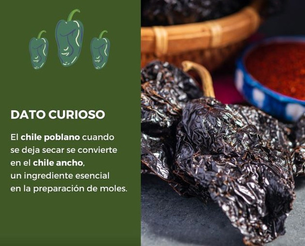 De sabor suave y aroma profundo, el chile poblano es la segunda variedad más producida y es indispensable en platillos emblemáticos como los chiles en nogada y los chiles rellenos, debido a su tamaño grande y pulpa carnosa. Además, lo suelen convertir en chile ancho al secarse.