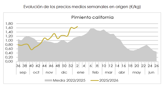 El pimiento California amarillo es el tipo comercial de pimiento más valorado esta semana. La oferta de pimiento es limitada, especialmente la de este color y más aún la de calibres adecuados para su exportación en envasado tricolor. El pimiento California registra esta semana el valor más elevado de las tres últimas campañas.