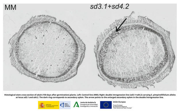 - Efecto en la estructura interna del tallo: El análisis histológico de ILs reveló que QTLs específicos (sd3.1, sd4.1 y sd11.1) regulan distintas estructuras anatómicas que impulsan el crecimiento secundario, incluyendo el tamaño de la médula, el área de la corteza y el desarrollo del xilema secundario.