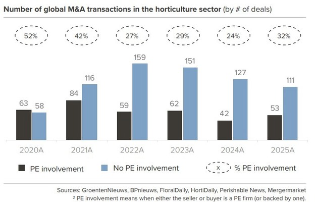 El periodo COVID-19 —que primero impulsó la floricultura y luego provocó una brusca corrección— desmintió las suposiciones previas de estabilidad estructural. La posterior crisis energética expuso aún más la vulnerabilidad de todo el sector hortícola, con muchas empresas afectadas directa o indirectamente por los elevados precios del gas. Tras este periodo de cautela, los inversores en capital privado están volviendo a interesarse por el sector hortícola. Tanto los segmentos ornamentales como los comestibles están experimentando un renovado interés. Los datos de operaciones reflejan esta tendencia: después de que la participación de PE disminuyera del 52% en 2020 a ~25% entre 2022 y 2024, ha comenzado a recuperarse, alcanzando el 32% en 2025, lo que indica una renovada confianza en los fundamentos del sector.