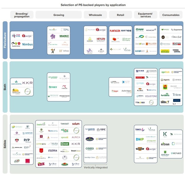 Como complemento a los estudios de casos individuales, una perspectiva de mercado más amplia destaca una selección de actores respaldados por PE en toda la cadena de valor hortícola, clasificados por aplicación. Este mapa muestra dónde se sitúan actualmente los patrocinadores financieros y cómo su actividad abarca la cría, el cultivo, el comercio mayorista, el retailer, el equipamiento, los servicios y los consumibles.