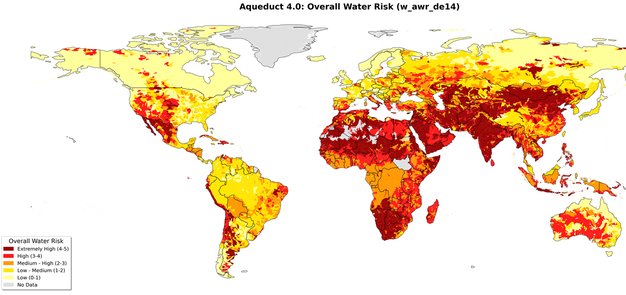 Los puntajes de riesgo hídrico reflejan el valor agregado de la cantidad y calidad del agua, así como los riesgos regulatorios y reputacionales para los suministros. Valores más altos indican mayores riesgos relacionados con el agua. Mapa del United Nations University Institute for Water, Environment and Health, basado en Aqueduct 4.0.