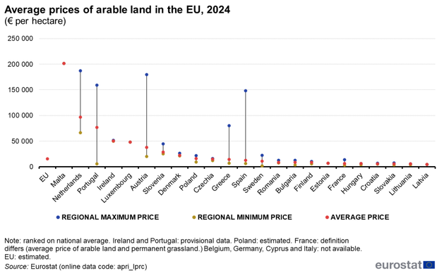 Entre los 23 países de la UE para los que hay datos disponibles de 2024, el precio de una hectárea de tierra arable osciló entre una media mínima de 4.825 € en Letonia y una media máxima de 201.263 € en Malta. Los datos de Malta reflejan la limitada disponibilidad de tierra agrícola y la presión derivada de usos alternativos, lo que da lugar a precios más elevados que en otros países de la UE.