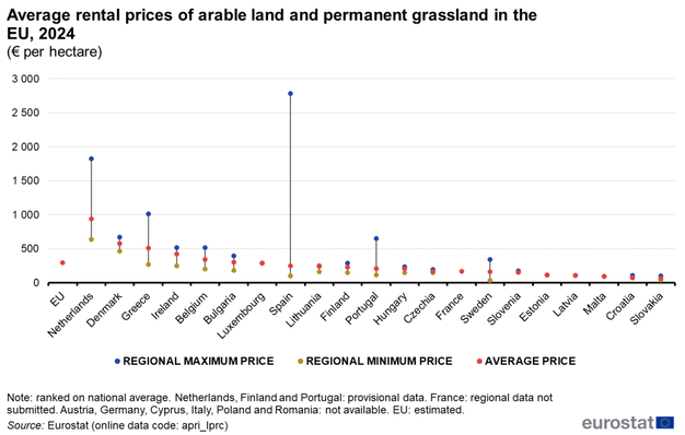 En el conjunto de la UE, el precio medio de alquiler de tierra arable y/o pastos permanentes fue de 295 € por hectárea en 2024. Alquilar una hectárea de tierra arable y/o pastos permanentes en 2024 fue más caro en Países Bajos (941 € de media), seguido de Dinamarca (580 €) y Grecia (509 €). Los precios más bajos se registraron en Eslovaquia (69 € de media), Croacia (76 €) y Malta (92 €), este último reflejando un tope impuesto por el gobierno en virtud de la Agricultural Leases (Reletting) Act.