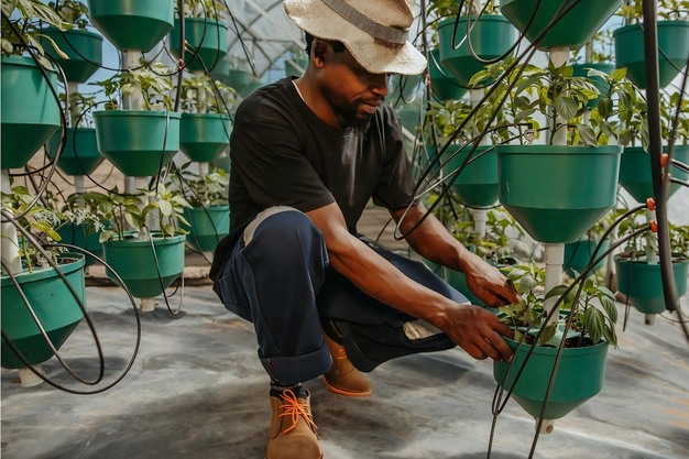 El sistema productor africano utilizado en HandPicked es un diseño hidropónico híbrido de bajos insumos que emplea fibra de coco como medio de cultivo y se basa en el riego por gravedad en lugar del bombeo continuo o de los sistemas de recirculación total. El diseño da prioridad a la sencillez, la durabilidad y la facilidad de uso frente a la automatización o el control de grandes volúmenes de datos.