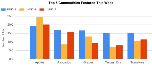 Los folletos de los retailers destacaban una amplia gama de productos utilizados en bandejas de aperitivos y platos de fiesta. Los aguacates ocuparon un lugar destacado, junto con los jalapeños, el cilantro, las cebollas, los tomates Roma y los tomatillos. También se anunciaban zanahorias tiernas, apio, coliflor, brócoli y pimientos. Los limones y las limas también aparecían con frecuencia, vinculados tanto a bebidas como a preparaciones frescas. Paralelamente, las primeras promociones de San Valentín se hicieron visibles mediante anuncios que combinaban productos agrícolas con arreglos florales, confitería y fresas cubiertas de chocolate.