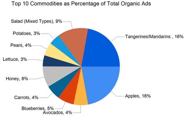 Por grupos de productos, las frutas representaron 146.538 anuncios, es decir, el 52% del total. Le siguieron las hortalizas, con 95.617 anuncios, lo que representa el 34%. Las cebollas y las patatas juntas alcanzaron 28.441 anuncios, es decir, el 10%. Las hierbas aromáticas suman 3.876 anuncios, las plantas ornamentales 5.668, el cáñamo 553 y la miel 2.350. Los productos ecológicos aparecen en 26.926 anuncios. Los productos ecológicos aparecen en 26.926 anuncios, lo que equivale al 10% del volumen total de publicidad.