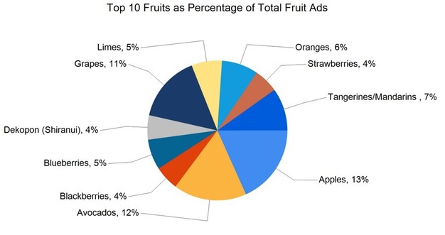 El número total de anuncios relacionados con frutas y hortalizas ascendió a 279.167, lo que representa un aumento del 3% respecto a los 270.431 de la semana anterior. En comparación con la misma semana del año pasado, el volumen de anuncios fue un 2% superior a los 273.836 anuncios registrados entonces.