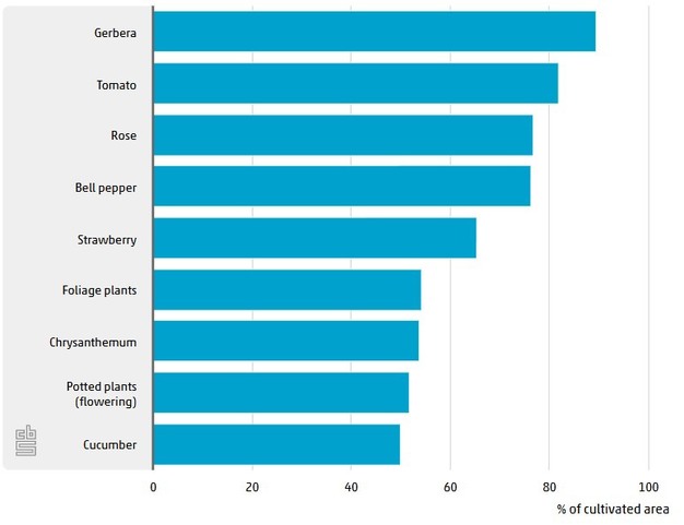 Se consultó a productores de pepino, pimiento, tomate, fresa, gerbera, crisantemo y rosa, así como a plantas de flor en maceta y plantas ornamentales de follaje, sobre el uso de métodos biológicos de control de plagas. Aproximadamente la mitad de los productores bajo invernadero cultivan alguna de estas especies y, en conjunto, representan el 70% de la superficie total de cultivo en invernadero en los Países Bajos, que asciende a 10.000 hectáreas.