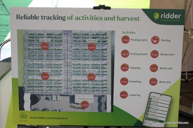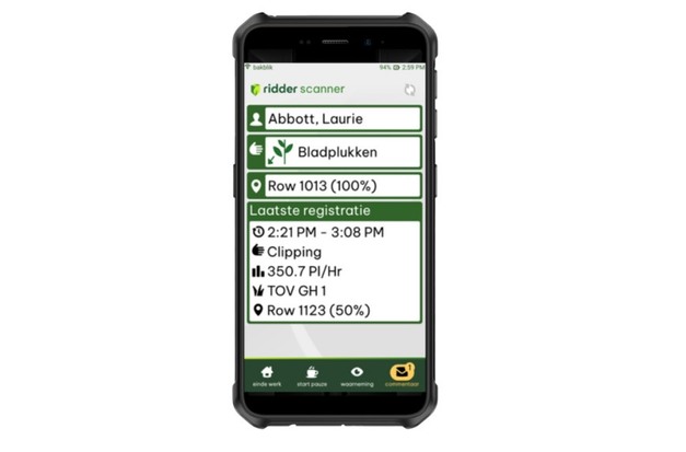 Niels explica que, para ello, se trabaja con escáneres capaces de escanear etiquetas NFC y códigos QR. "En una versión anterior del sistema que ofrece Ridder y que muchos productores todavía usan, se trabaja con terminales en lugares fijos en el invernadero, en los que puedes registrar las actividades laborales ingresando los códigos correspondientes. A veces se cometen errores en ese proceso. Con el escaneo de una etiqueta NFC en una fila, carro de cosecha o en un punnet o caja, la probabilidad de errores es mucho menor. Según los usuarios, esto es algo que se nota mucho cuando dejan de realizar el registro en terminales en el invernadero y empiezan a usar escáneres y etiquetas NFC".