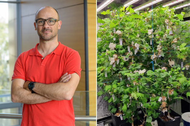 Filipe Natalio y una planta de algodón hidropónico totalmente de interior