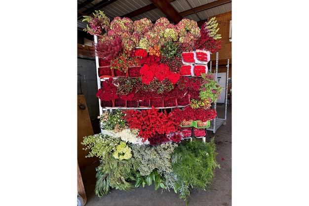 Exposición de productos de la semana de San Valentín en Florabundance, Carpinteria, California. Una amplia mezcla de rosas, hortensias, hipericum, claveles, gerberas y plantas de temporada preparadas para su distribución nacional de un día para otro.