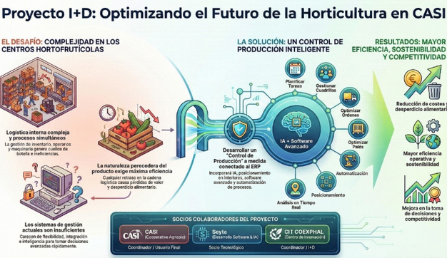 La Cooperativa Agrícola San Isidro (CASI), especialista en tomate, ha lanzado un ambicioso proyecto de Investigación, Desarrollo e Innovación (I+D+i) coordinado por el Centro de Innovación Tecnológica (CIT) de COEXPHAL. El proyecto se titula: "Desarrollo, evaluación e implementación de un Control de Producción con herramientas de IA para la optimización de recursos y la sostenibilidad en los Centros de Comercialización y Manipulado de CASI". Esta iniciativa tiene como objetivo fundamental mejorar la eficiencia y la sostenibilidad de la gestión en los centros hortofrutícolas de la cooperativa.
